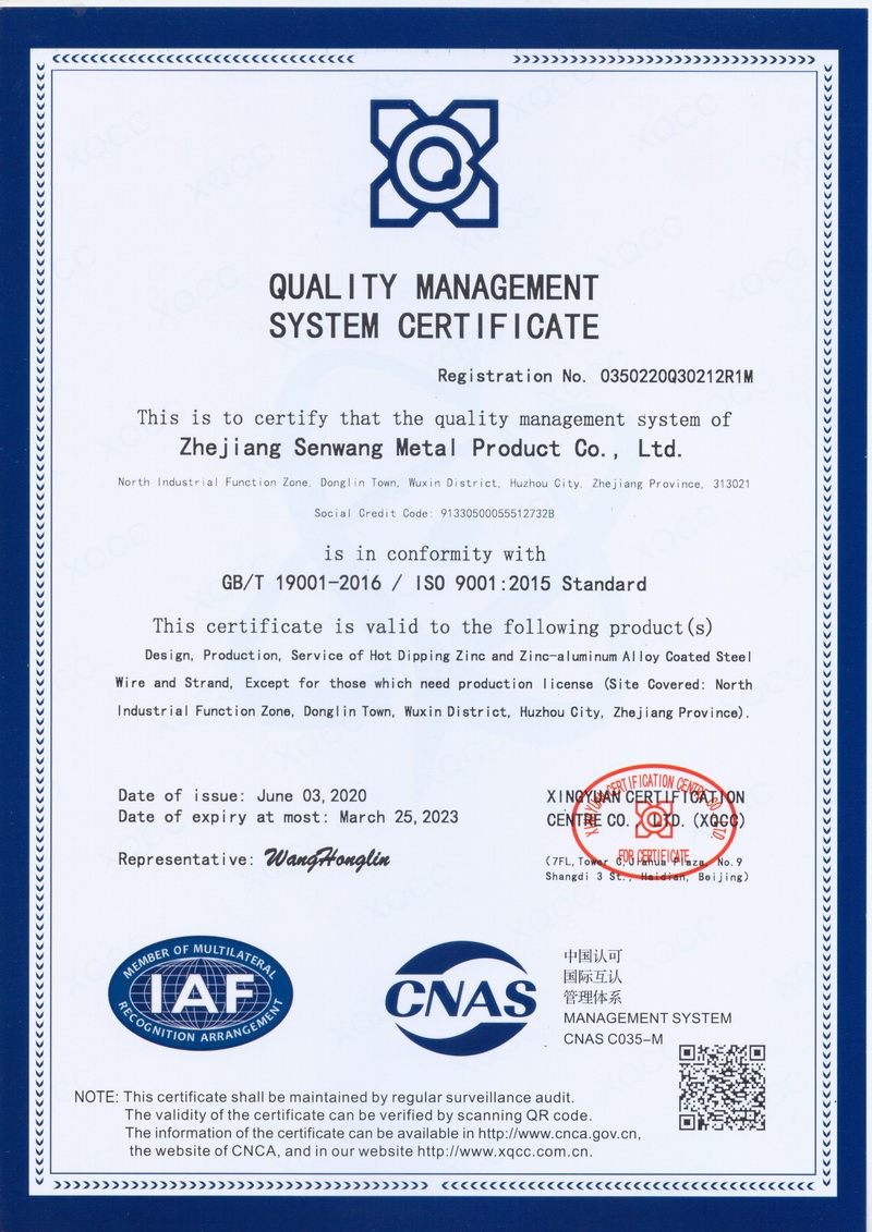 浙江森旺金屬制品有限公司成立于2012年,坐落湖州市吳興區(qū)東林鎮(zhèn)工業(yè)功能區(qū)。公司專業(yè)從事各類鍍鋅鋼絲、鋼絞線等產(chǎn)品的開發(fā)及生產(chǎn)。目前產(chǎn)品已廣泛應(yīng)用于各類通信光電纜,電力輸送,電氣化鐵路工程,各類堤壩防護(hù)及農(nóng)業(yè)溫室等工程領(lǐng)域。公司秉承“追求卓越品質(zhì),創(chuàng)建卓著信譽”的經(jīng)營理念,始終堅持專業(yè)化、規(guī)模化的經(jīng)營模式。